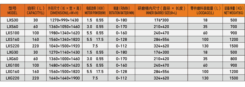 1、设有变频系统,可根据需要任意调节研磨桶转速。 2、内衬桶采用进口耐磨聚氨酯制作,可随时更换。具有耐 酸碱、成本低、使用寿命长、更换速度快等特点。 3、30升、60升、100升设备采用高强度尼龙齿轮传动, 160升、220升设备采用同步带传动,具有噪音小、使用寿命 长、运转平衡稳定等特点。 4、采用弧形拉门设计,并设有安全接触开关,具有节约空 间、操作安全等特点。 5、该机型接料槽下方可配备振动分选筛车,配备后可实现 工件磨料自动分选。 1、Equipped with frequency conversion system, can adjust grinding drum speed as needed. 2、The inner liner is made of imported abrasion-resistant polyurethane and can be replaced at any time. It has the characteristics of acid and alkali resistance, low cost, long service life and fast replacement. 3、The 30-liter, 60-liter, 100-liter equipment adopts high-strength nylon gear transmission, and the 160 litre and 220 litre equipment adopts synchronous belt transmission, which has the characteristics of small noise, long service life and stable operation. 4、With the design of the arc sliding door, the safety contact switch is provided, which has the characteristics of saving space and operating safety. 5、This machine can be equipped with vibrating screen cart under the feeding trough, then the workpiece and media can be automatic seperation. |
